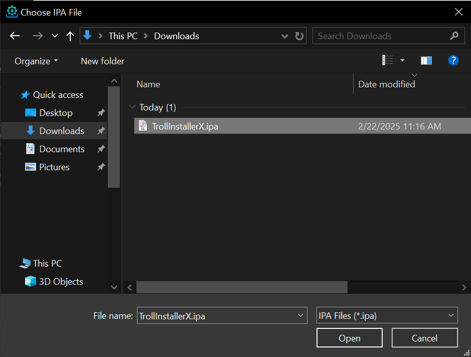 3. Click on the IPA icon in Sideloadly and pick your TrollInstallerX IPA file from Step 1. (see images)